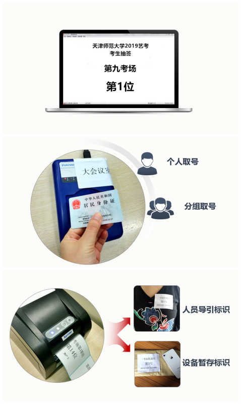 凭借智能面试评分系统的强大功能,天津师范大学的艺考校招面试工作稳步进行。在考生抽签环节中:面试现场抽签信息大屏幕滚动展示、读卡机秒识别考生信息并自动录入系统、设备自动打印与考生信息相匹配的标贴用以候场面试,各流程环节流畅对接且准确无误。
