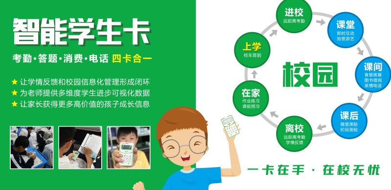 此外,基于RFID物联网技术的智能学生卡答题器,将答题、考勤、消费、电话等功能充分融合,形成校园管理智能化、课堂教学互动化、随堂测验日常化、校园生活一体化、家校沟通无缝化,使智慧校园整体解决方案真正实现了学生在校、在课堂的学习、生活轨迹全方位、多维度数据采集。