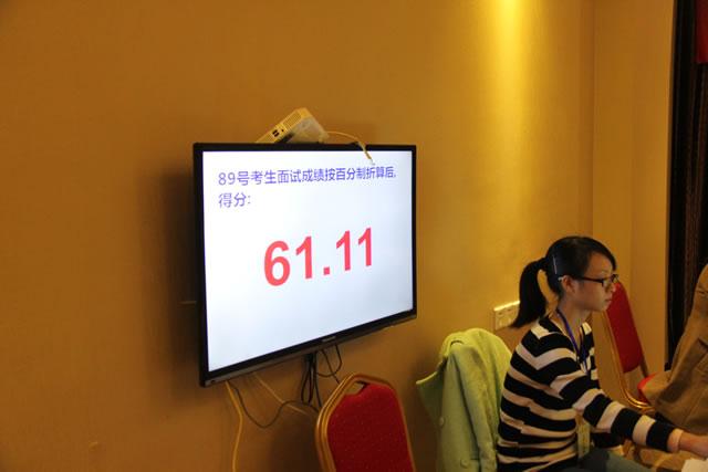 考生答题完毕后,评委使用电子评分器给考生独立评分,电脑自动去掉1个最高分、1个最低分后以其余面试评委评分的平均分值作为该考生面试成绩,并通过语音播报与屏幕显示当场将面试成绩告知考生本人。
