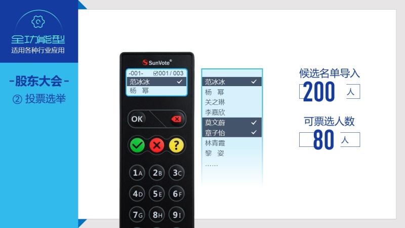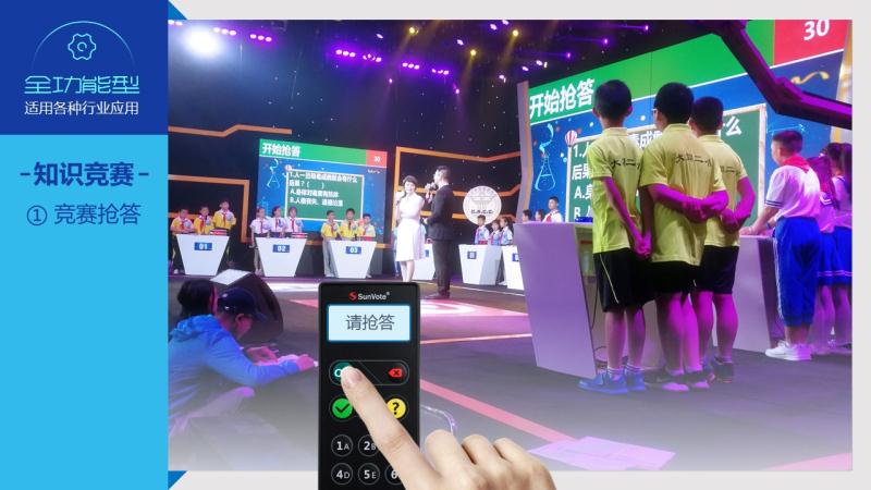 这款全能型现场投票器。满足了90%的各类会议活动应用需求,从最常见的产品路演现场调研,学术研讨观点反馈,员工培训考核评估,到紧张刺激的选秀大赛现场观众投票,知识竞赛分组抢答,乃至高端严谨的股东大会表决和选举都能发挥其效用。