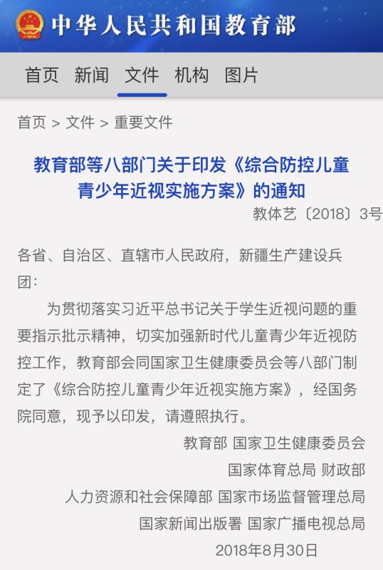 2018年8月30日,教育部、国家卫生健康委员会等八部门联合印发《综合防控儿童青少年近视实施方案》,对于学校方案中特别强调:科学合理使用电子产品,指导学生科学规范使用电子产品…严谨学生将个人手机、平板电脑等电子产品带入课堂…
