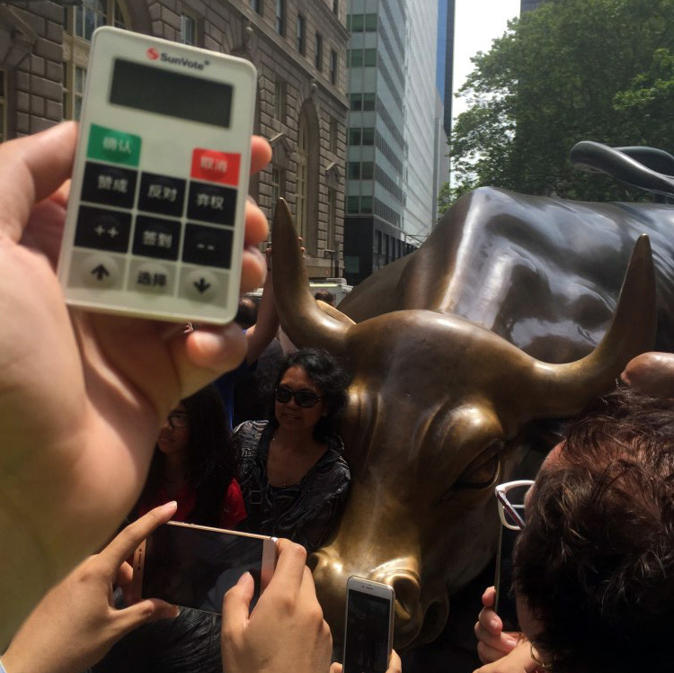 在美国奥兰多结束了每年必来的infoComm视听展,立马转战纽约,华尔街、铜牛、证交所,给SunVote取景拍片的小伙伴们真是相当给力和敬业……不过,游人太多,在铜牛边上想拍个牛身全景那是相当困难呀!